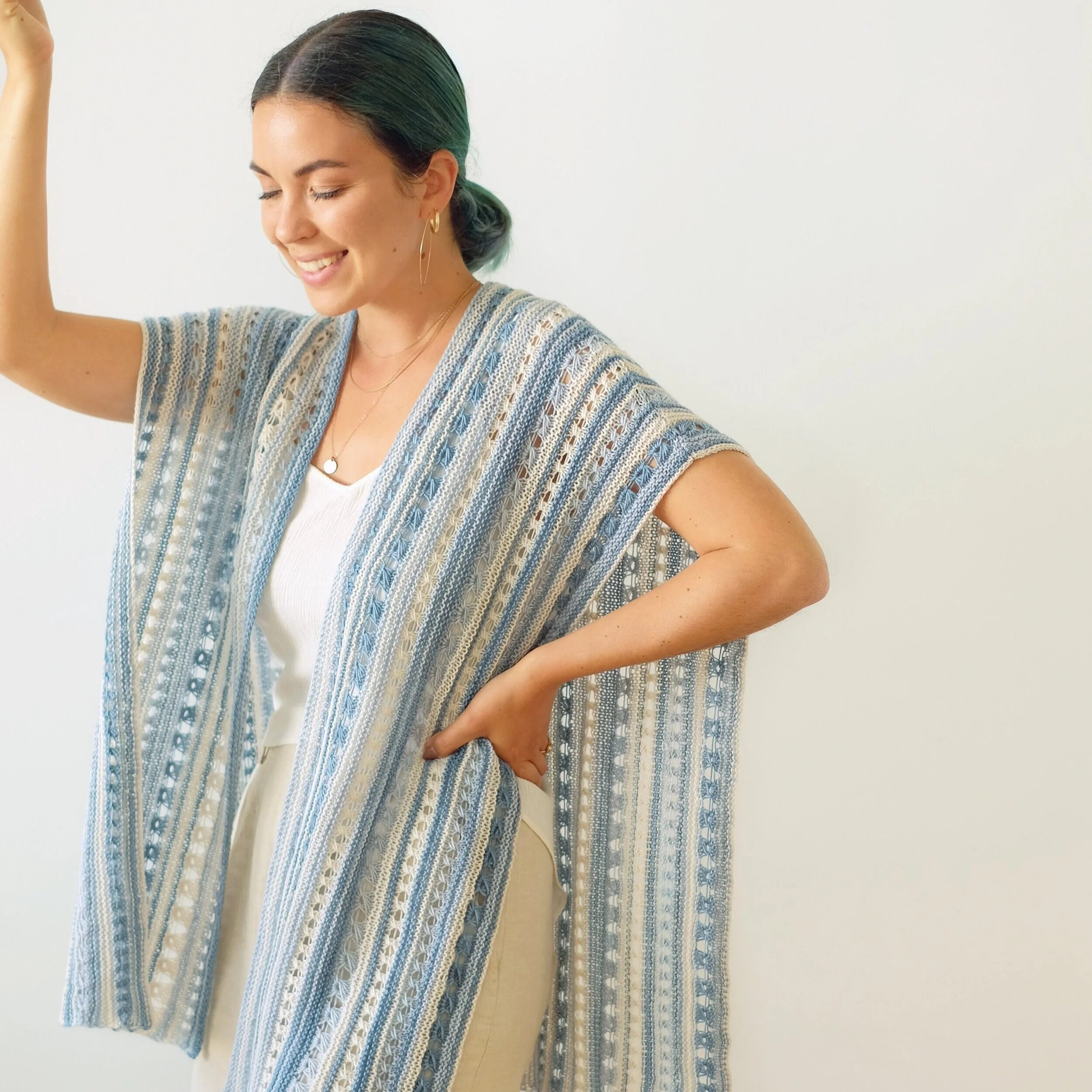 Ruana can be worked in any number of colors and is perfect for using up leftover yarn or mini skeins. Alternating stripes keep you entertained and are very satisfying to knit. Garter stitch works as a background for two unusual lace patterns that are easy to recreate with the video tutorials provided.