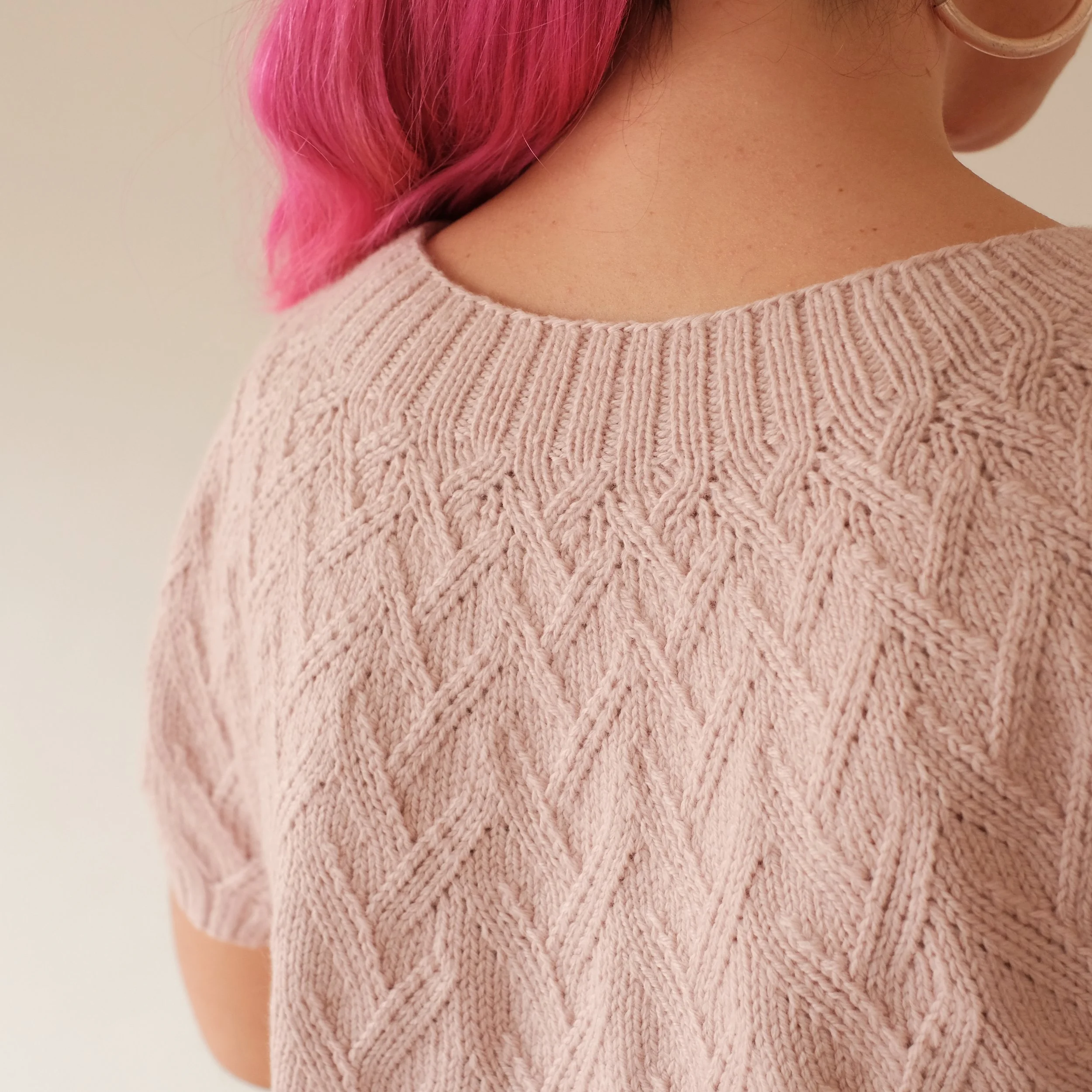 Sample tee yarn: The Palmetto Cottage Collection from The Royal Bee Yarn Company (100% superfine merino, 472yds / 100g) in color Ringland Pram Pink, held double. Get it here!