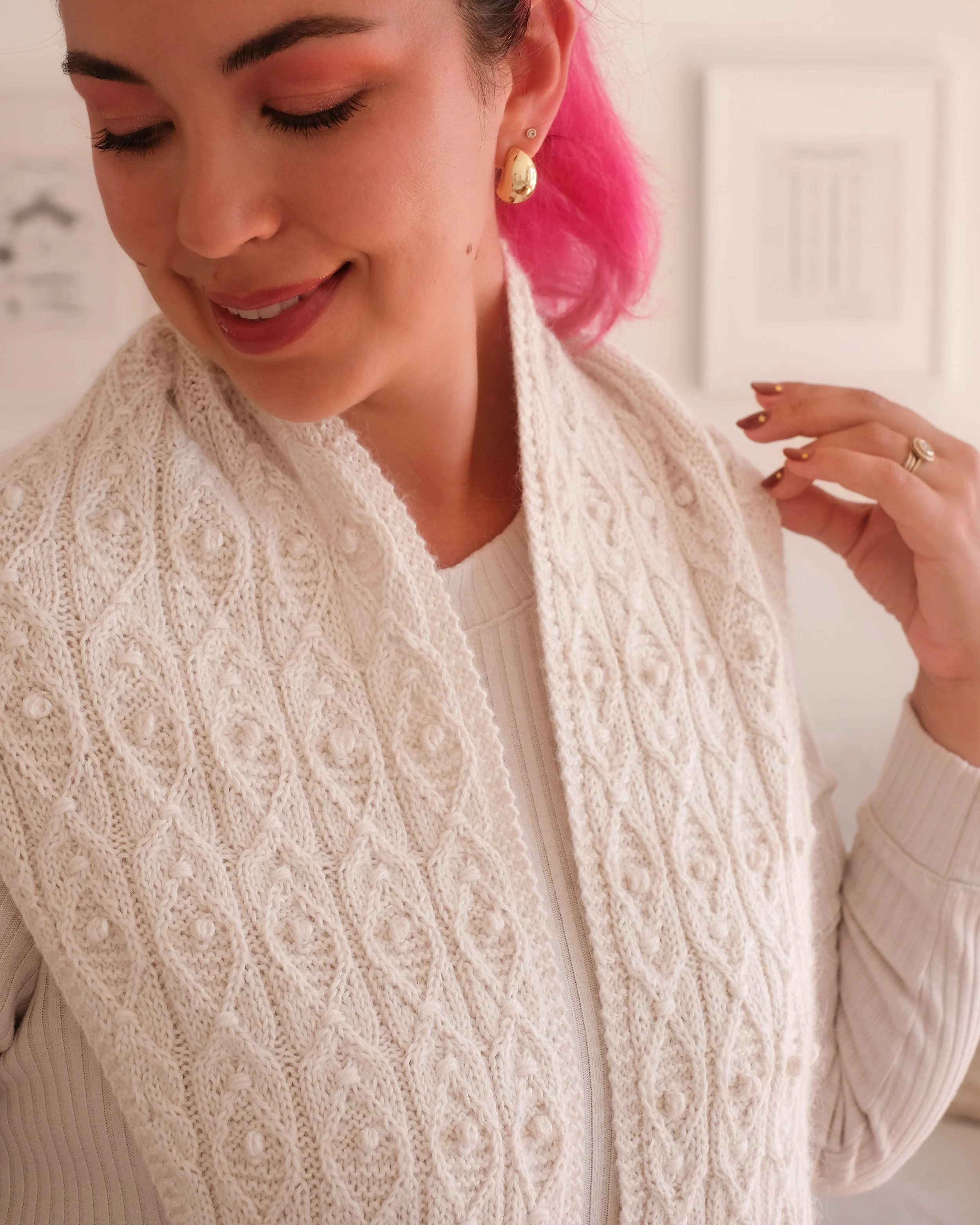 The pattern features traveling and wrapped stitches, nupps, a bit of cables and garter. Directions are both charted and written out. Videos for tricky techniques provided.
